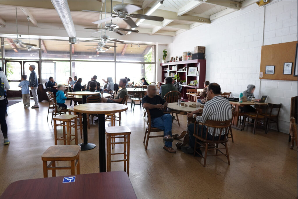 Inside decor reminds you of a local cafe, with historical details of the location which was originally a hardware store. Inside seating consists of large tables that can accommodate a big group and high tops for 2. They have an old coffee roaster and decoration sacks of coffee beans on display. The seating area is open seating – just find an open spot and have a seat, and there’s plenty of it. They have a homely aesthetic with bookshelves and knick knacks placed around the shop.
